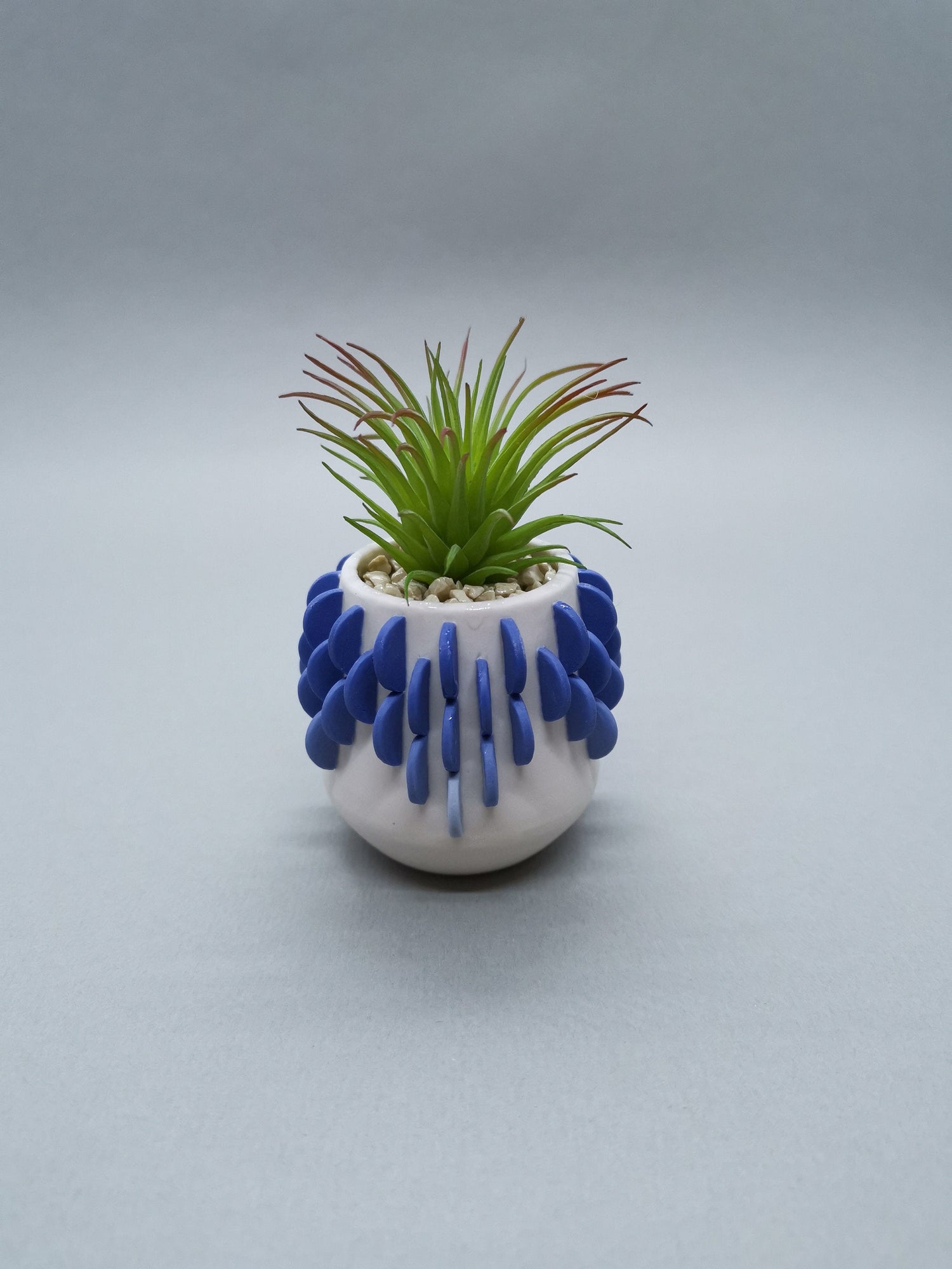 Artificial succulent in a blue gradient disk pot. Natural coloured gravel set with clear resin.
