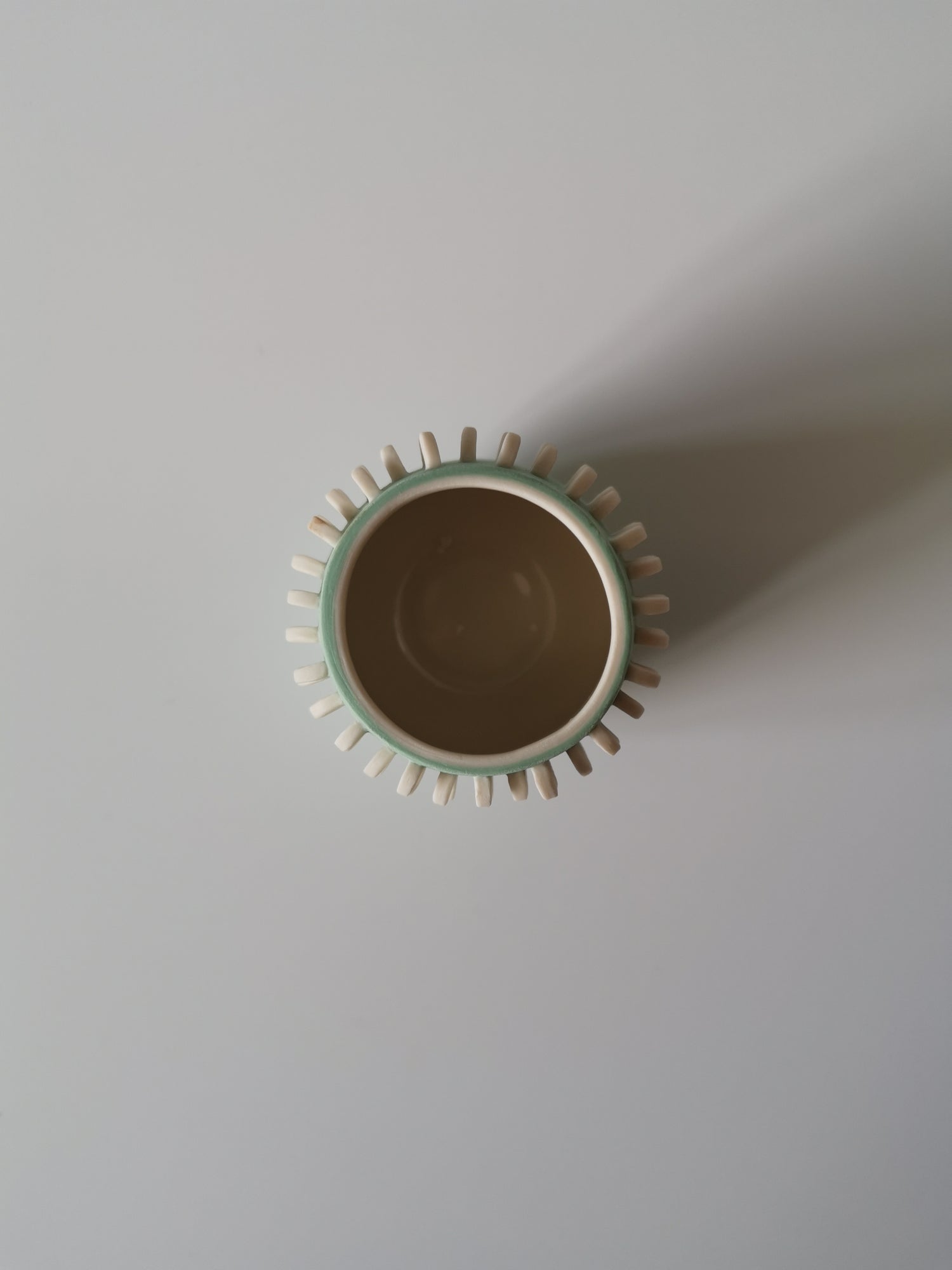 Beautiful handmade functional or sculptural double slip-cast vessel. Coloured outer and white interior with mini disks trickling down from the rim attached by hand one-by-one layer by layer. Made from porcelain and clear glazed on the inside.
