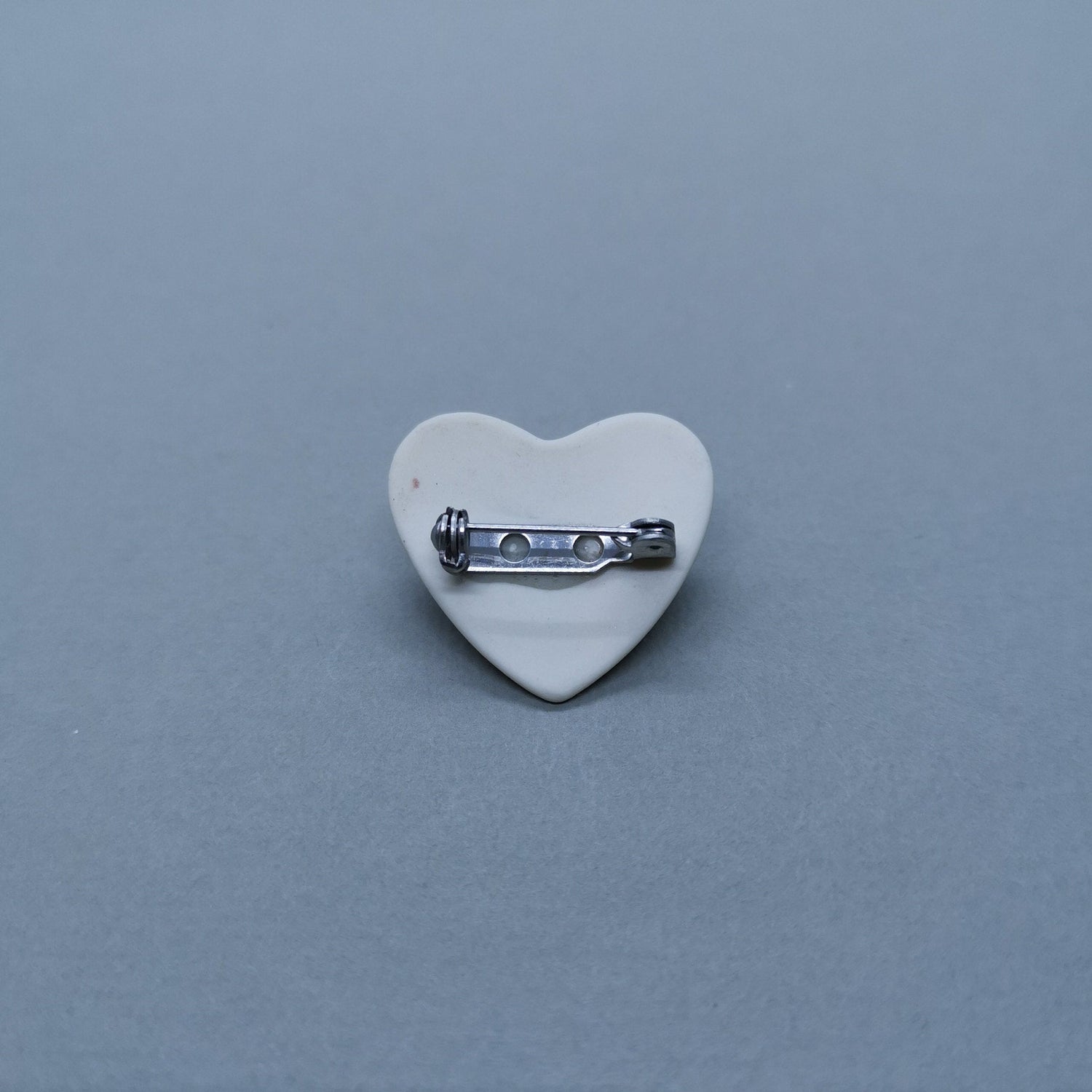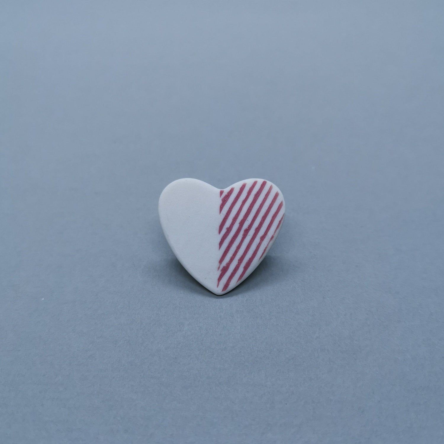 Handmade porcelain heart shaped brooch with red slip inlay.
