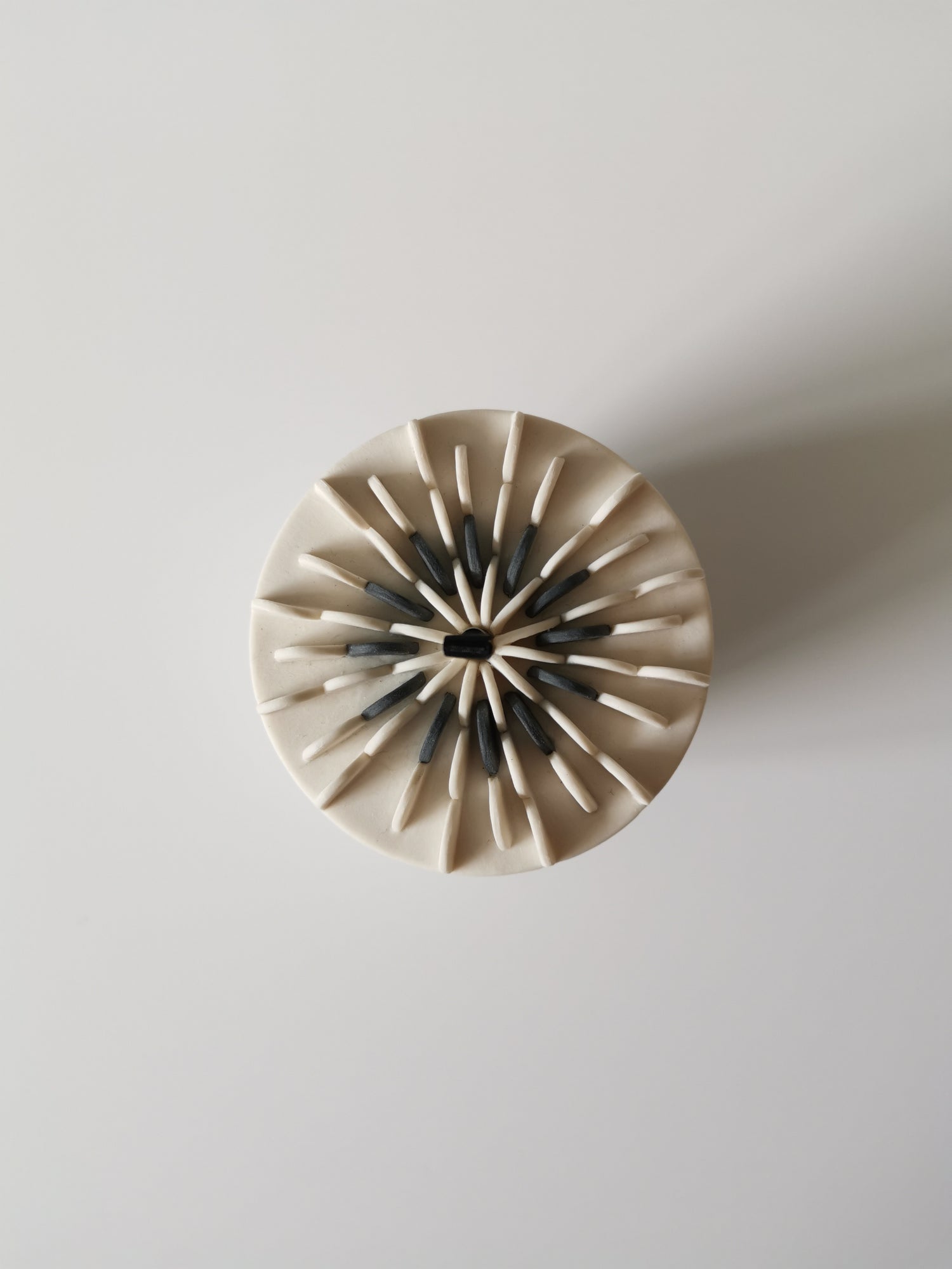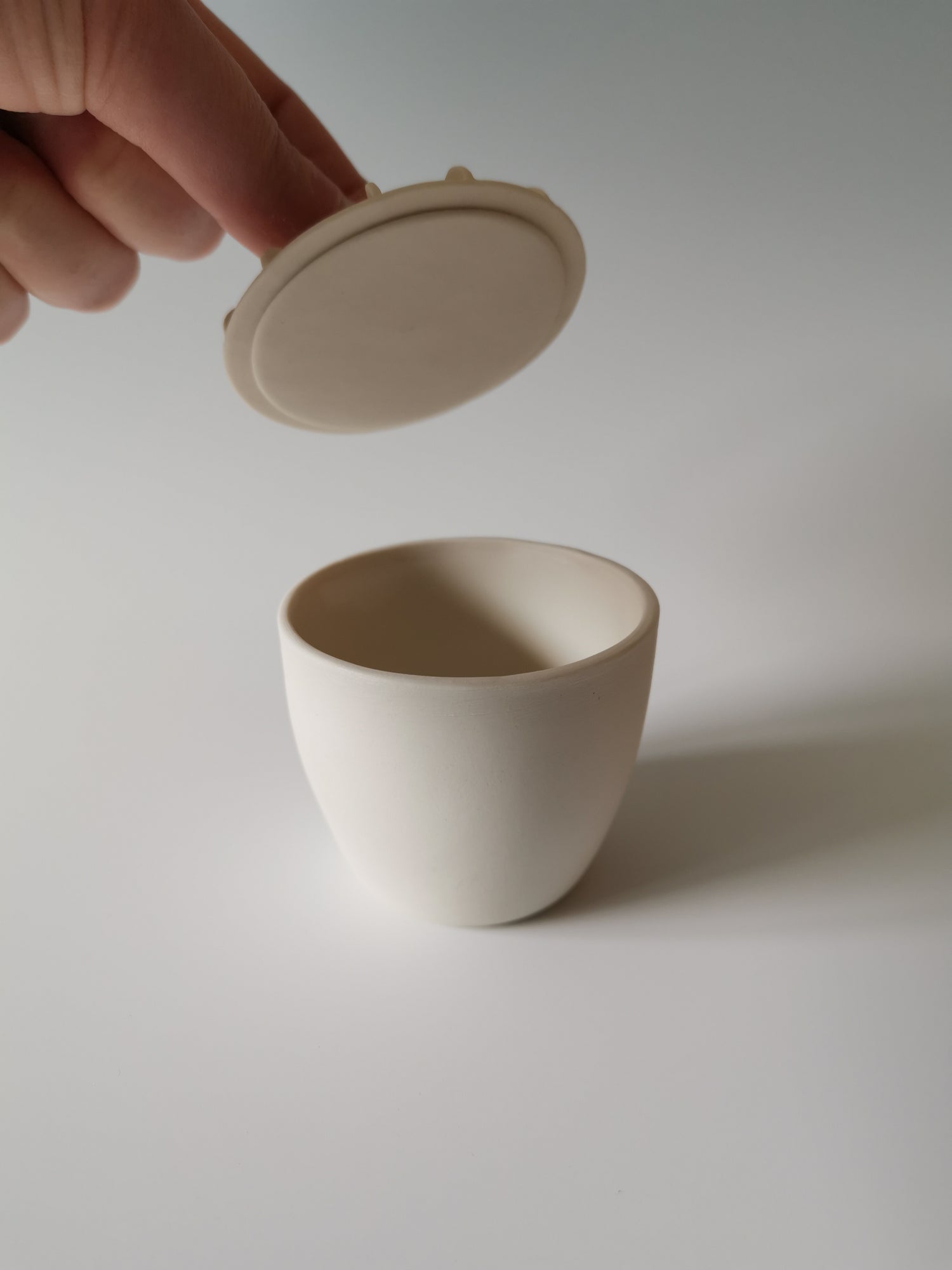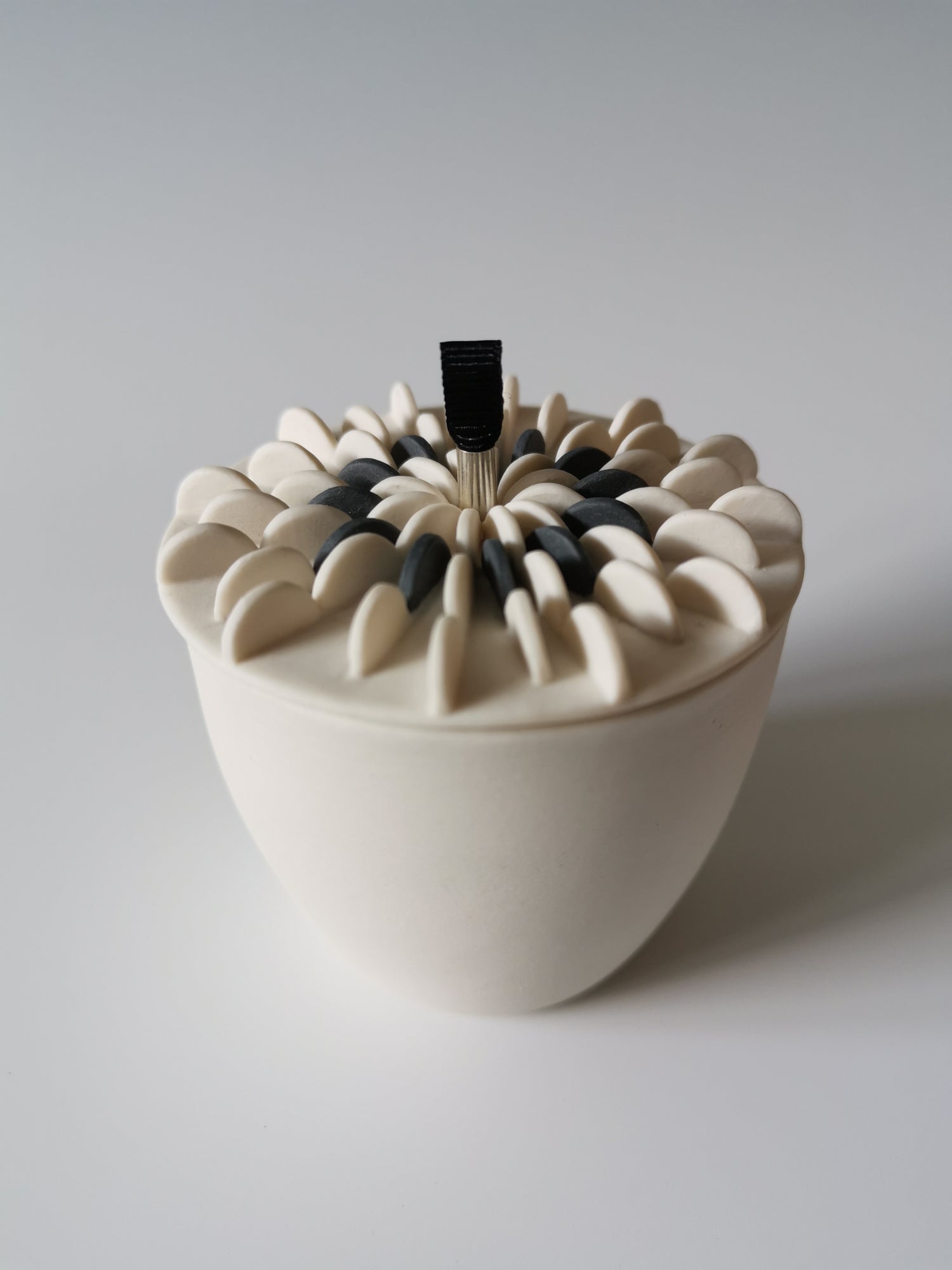 Handmade porcelain vessel with white and black disks attached to the lid. A black ribbon handle and sterling silver detail. Glazed clear on the inside.