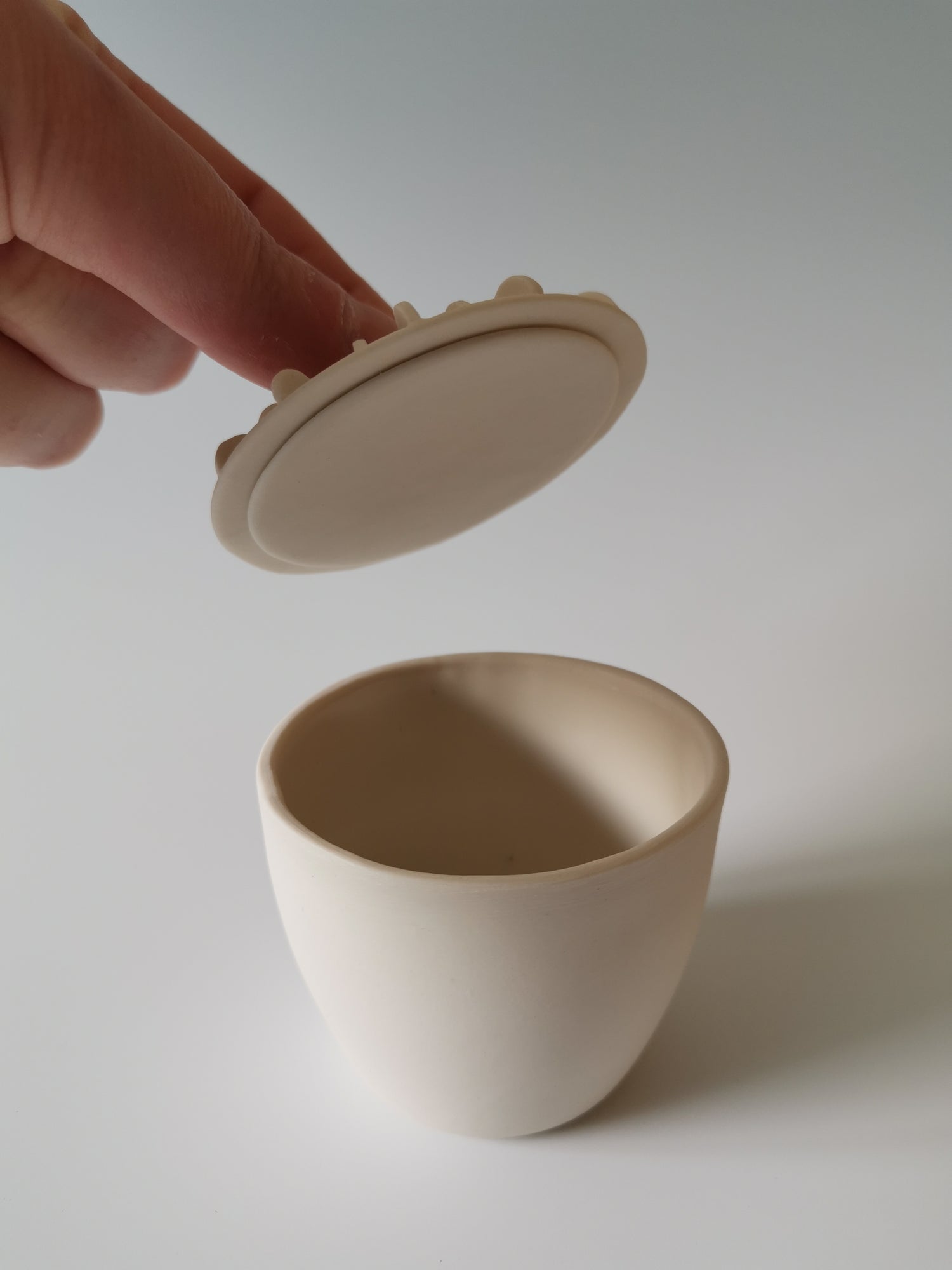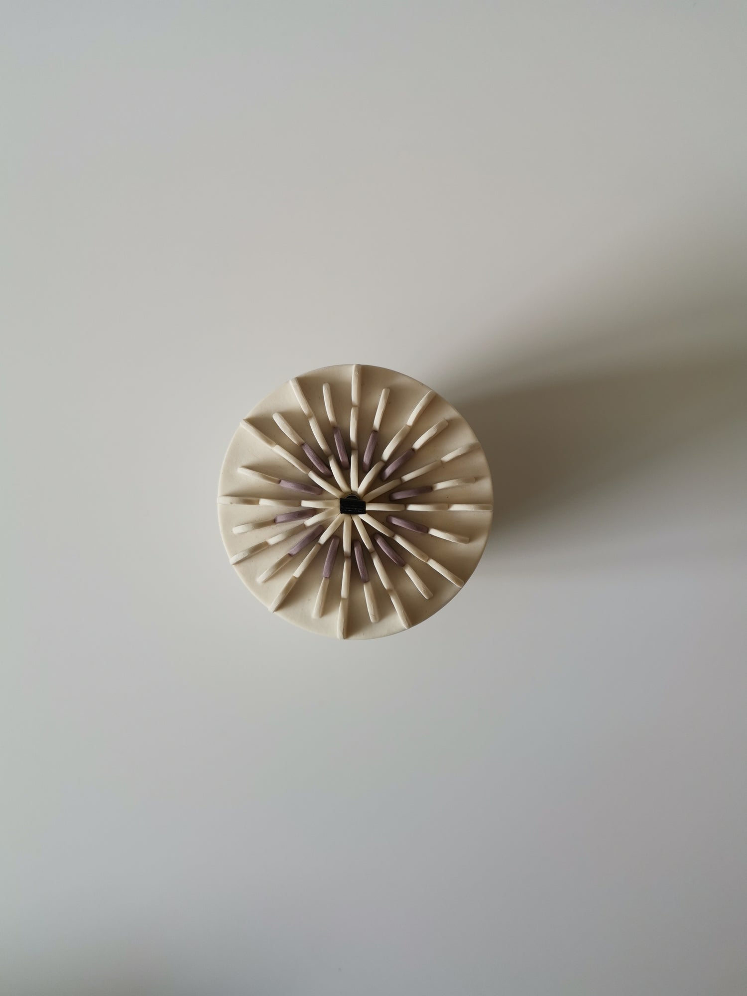 Handmade porcelain vessel with white and purple disks attached to the lid. A black ribbon handle and sterling silver detail. Glazed clear on the inside.