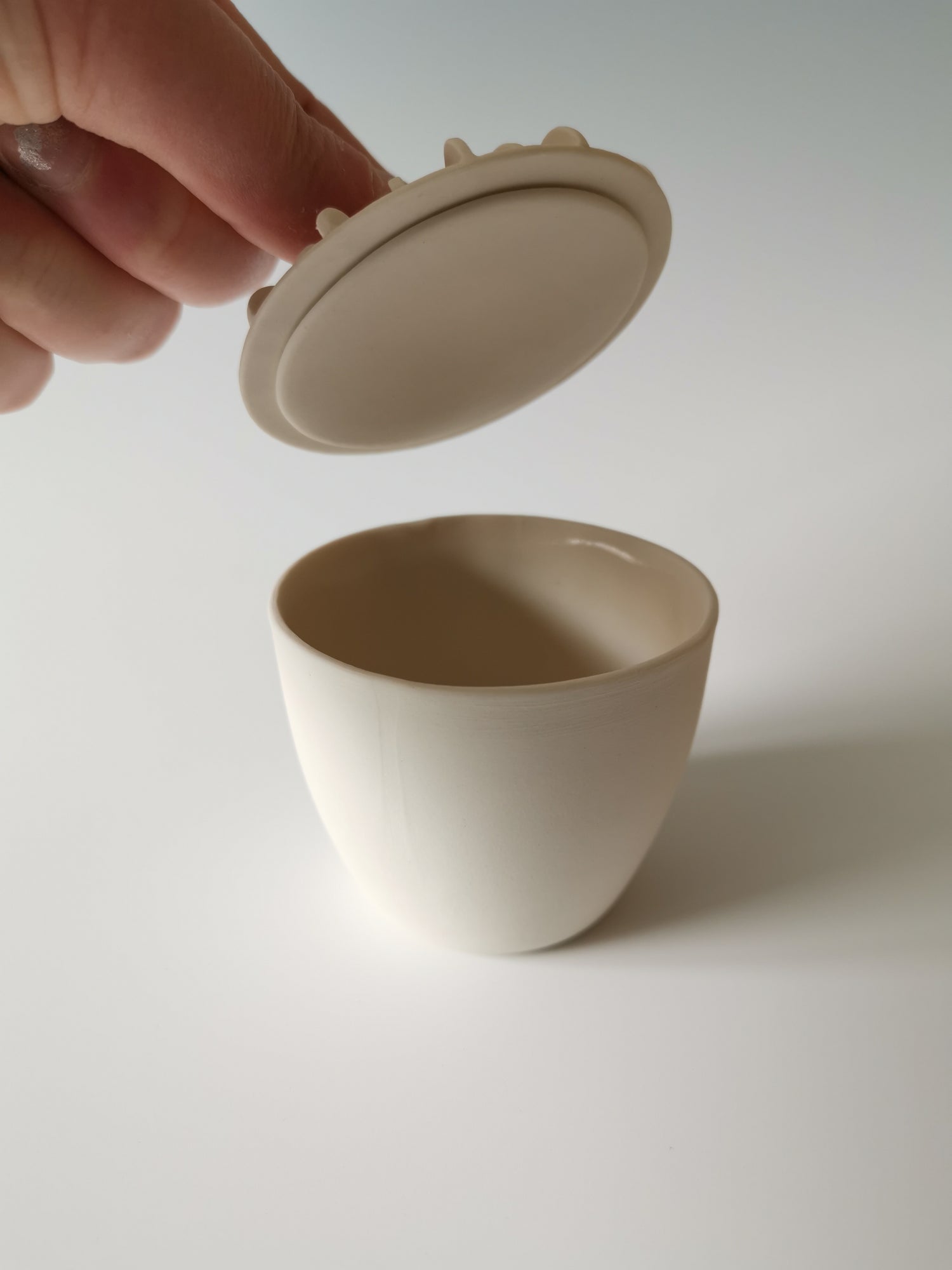 Handmade porcelain vessel with white and red disks attached to the lid. A black ribbon handle and sterling silver detail. Glazed clear on the inside.