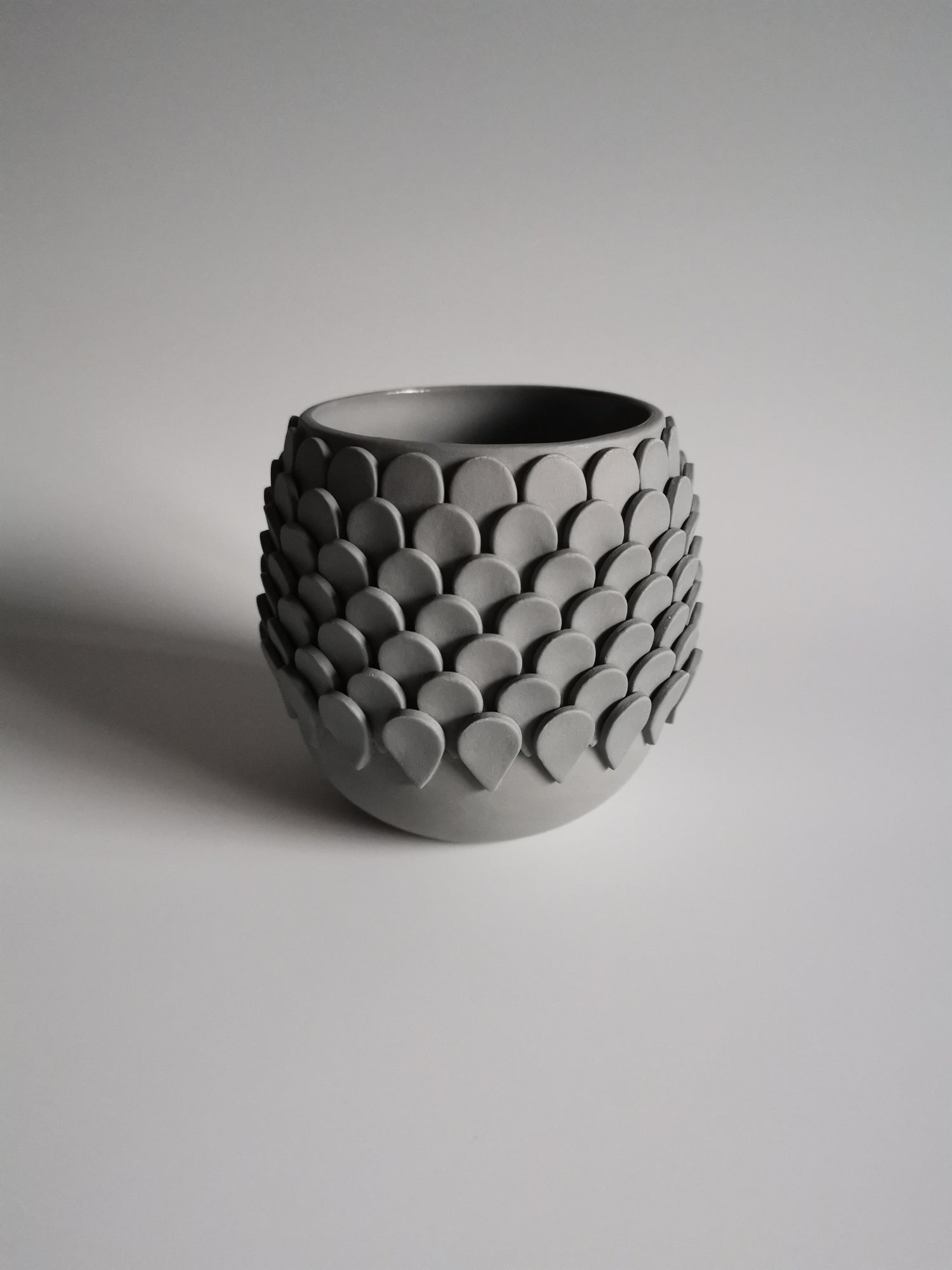 Handmade functional or sculptural porcelain vessel with porcelain teardrop shapes attached to a slip cast vessel. The teardrop shapes are attached using porcelain slip, one by one layer by layer, slightly overlapping. Clear glazed on the inside.