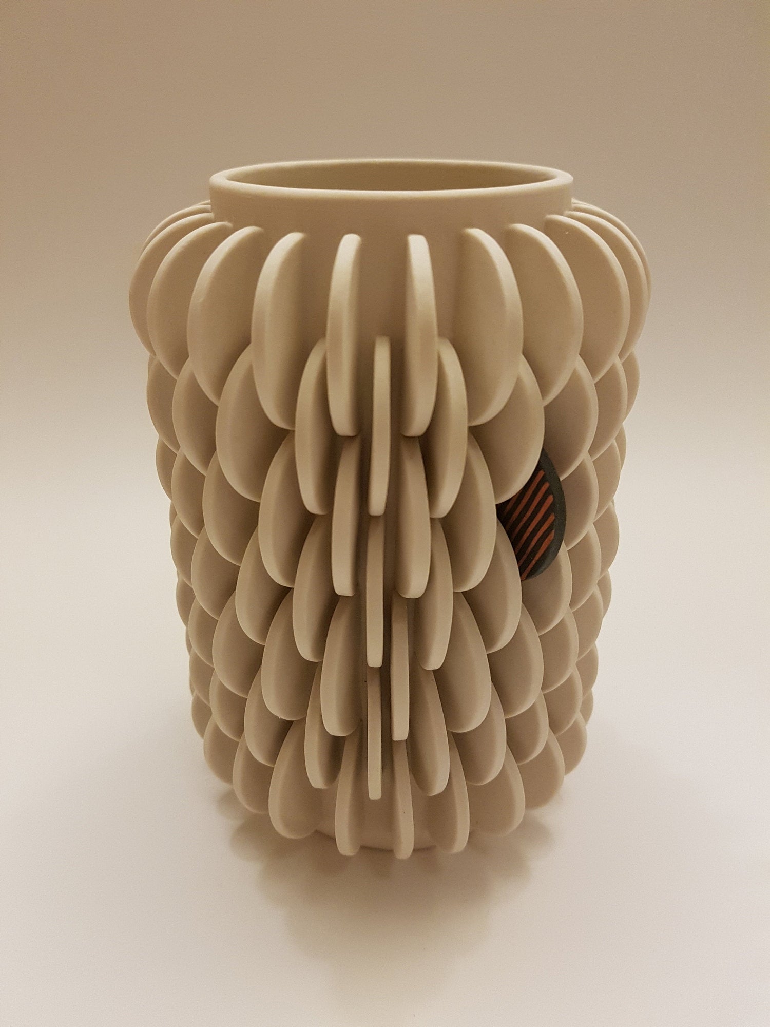 Stunning handmade porcelain vase with hand cut disks attached to a slip-cast cylinder. A single coloured disk with coloured inlay. Clear glazed on the inside so it can be used to hold a beautiful bouquet of flowers.