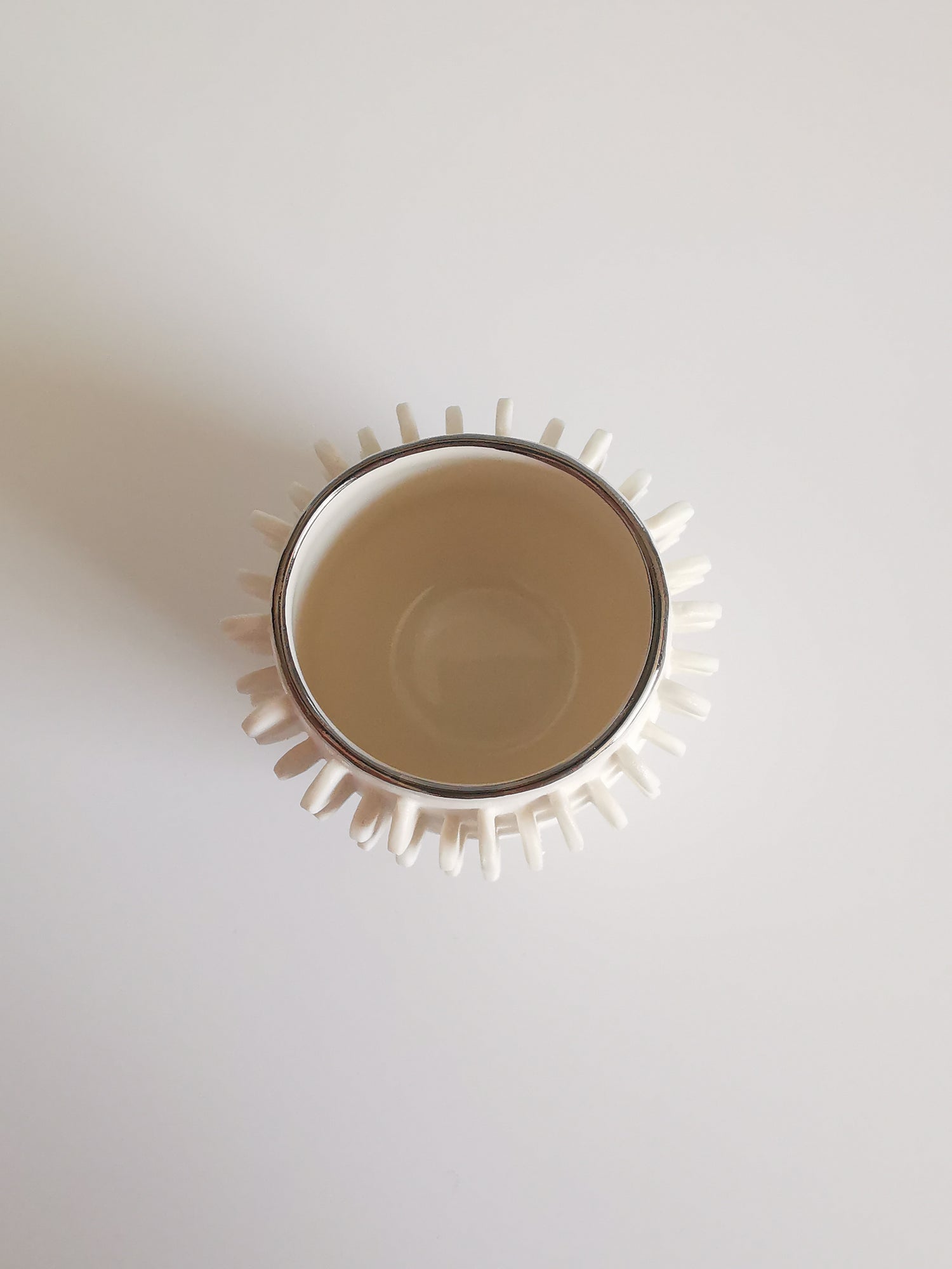 Handmade functional or sculptural porcelain vessel with disks attached to a slip cast vessel. The disks are attached using porcelain slip, one by one layer by layer to create a pattern. Clear glazed on the inside and platinum lustre detail on the rim.