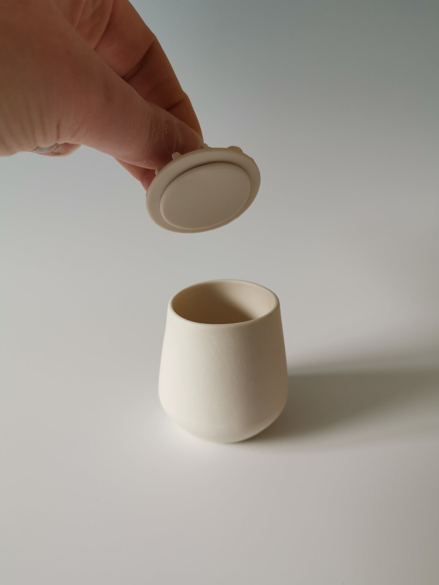 Handmade porcelain vessel with white and purple disks attached to the lid. A black ribbon handle and sterling silver detail. Glazed clear on the inside.