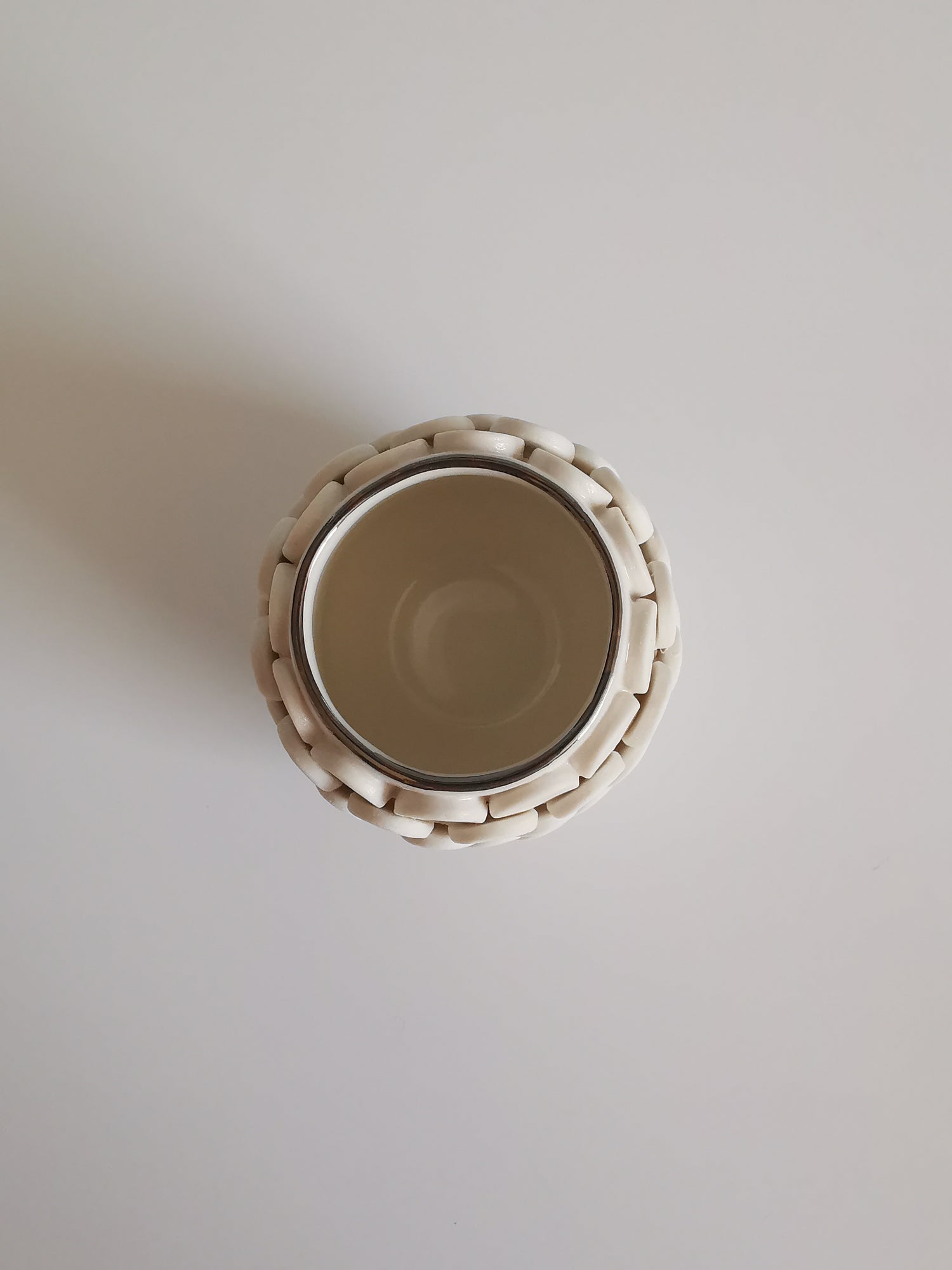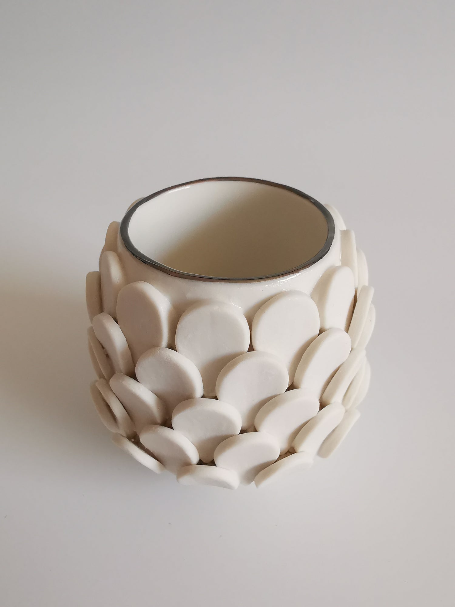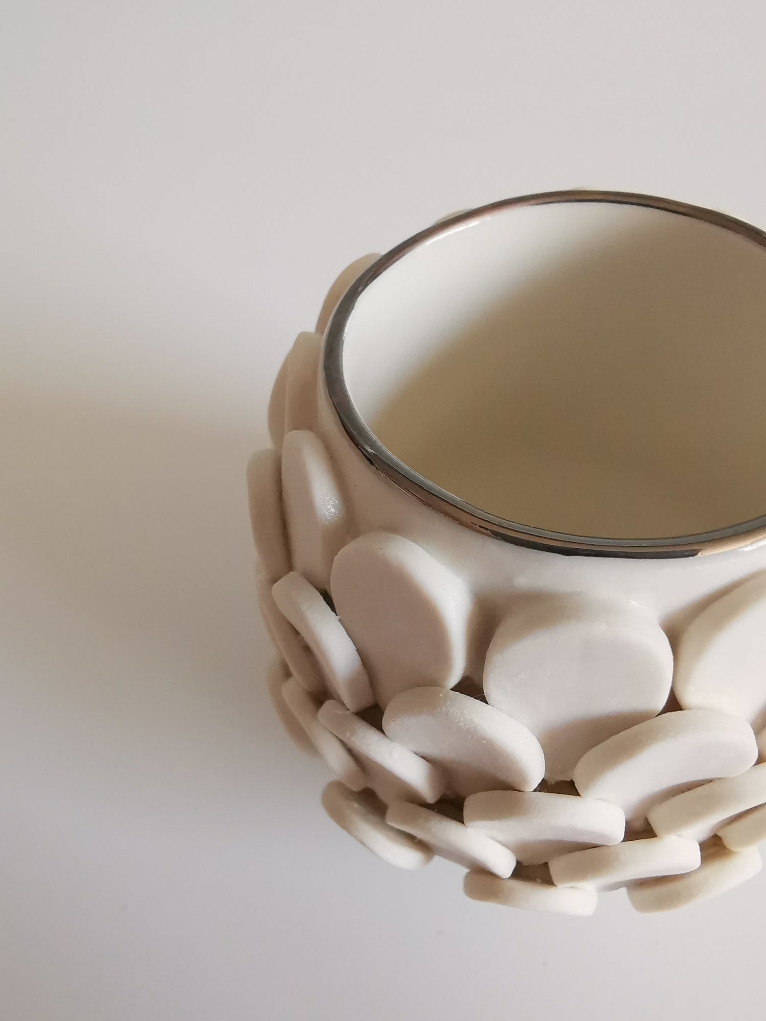 Handmade functional or sculptural porcelain vessel with teardrop shapes attached to a slip cast vessel. The teardrop shapes are attached using porcelain slip, one by one layer by layer, slightly overlapping. Clear glazed on the inside and platinum lustre detail on the rim.