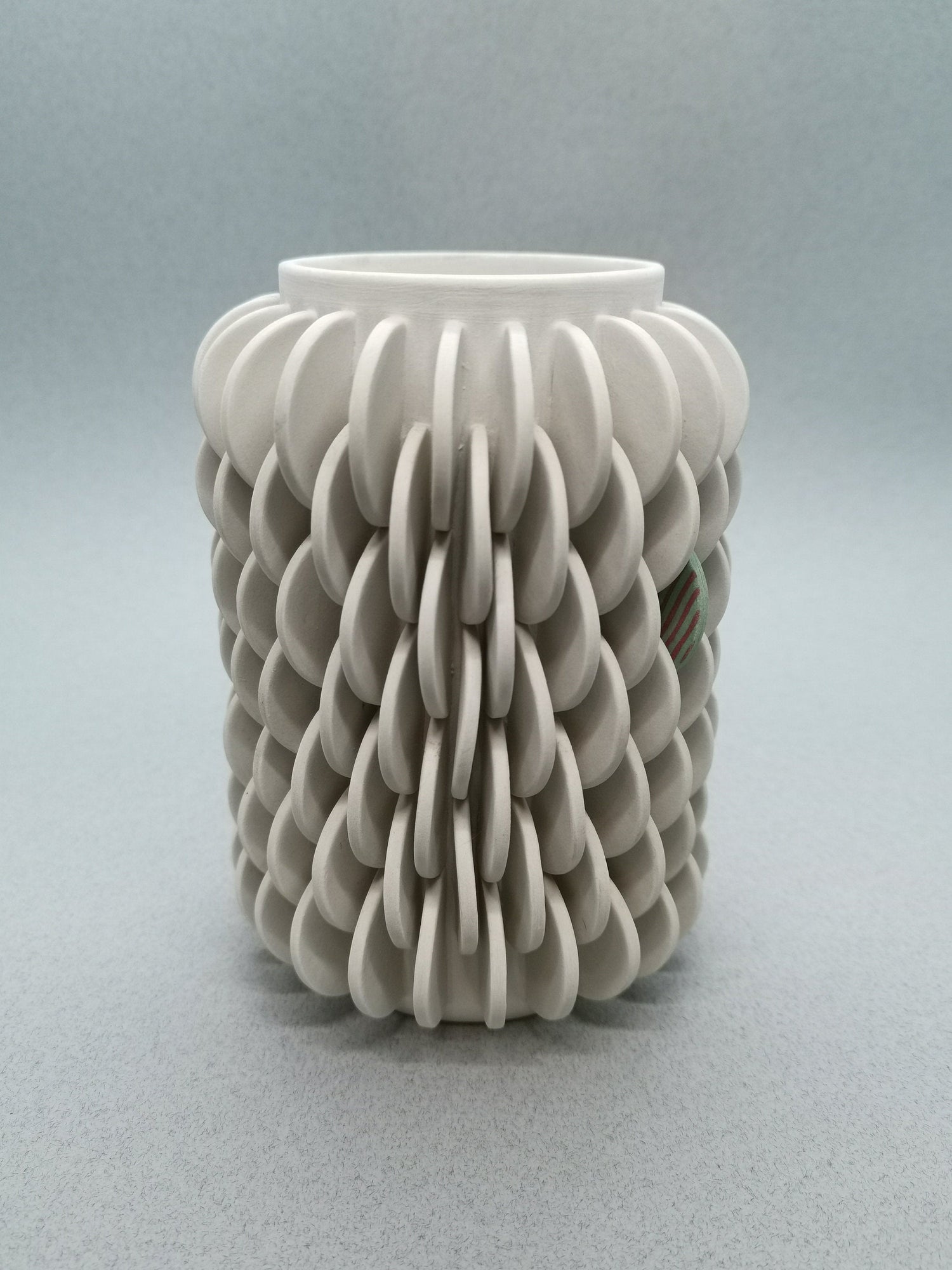 Stunning handmade porcelain vase with hand cut disks attached to a slip-cast cylinder. A single green disk with a red slip inlay. Clear glazed on the inside so it can be used to hold a beautiful bouquet of flowers.